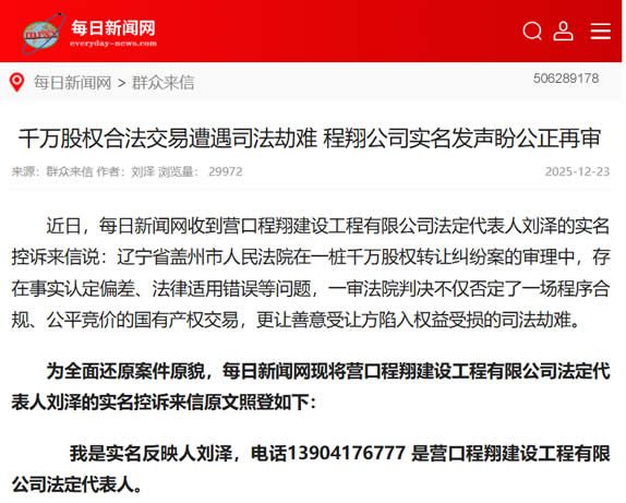 为全面还原案件原貌,每日新闻网现将营口程翔建设工程有限公司法定代表人刘泽的实名控诉来信原文照登如下: