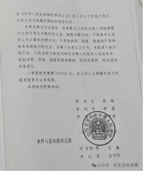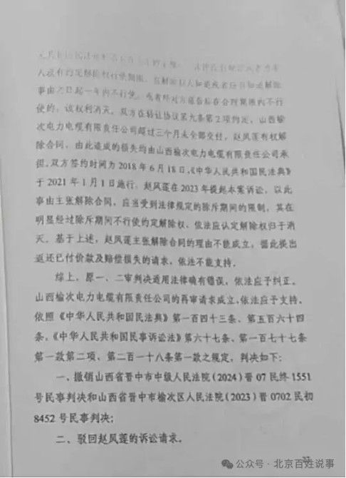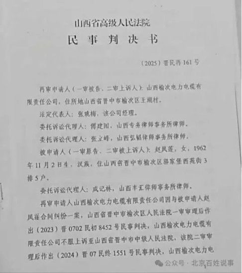 拿到晋中市中级人民法院的终审判决之后,赵凤莲压在心头多年的石头终于搬开,正当她静待榆缆公司履行判决义务的时候,榆缆公司依然表示不服,于2024年7月19日向山西省高级人民法院提出再审申请。