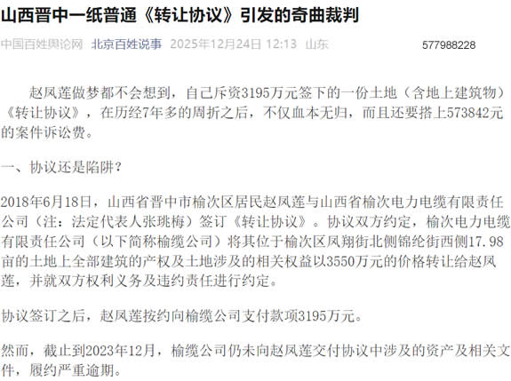 在多次敦促协商无果后,2023年12月8日,赵凤莲毅然向山西省晋中市榆次区人民法院提起诉讼,请求人民法院:一、依法判令解除其与榆缆公司签订的《转让协议》,责令被告榆缆公司返还原告已付款3195万元;二、依法判令被告榆缆公司以3195万元为基数,自2018年9月18日起,按照每日万分之五计算利息至实际付清之日止;三、依法判令被告榆缆公司承担本案诉讼费、保全费。